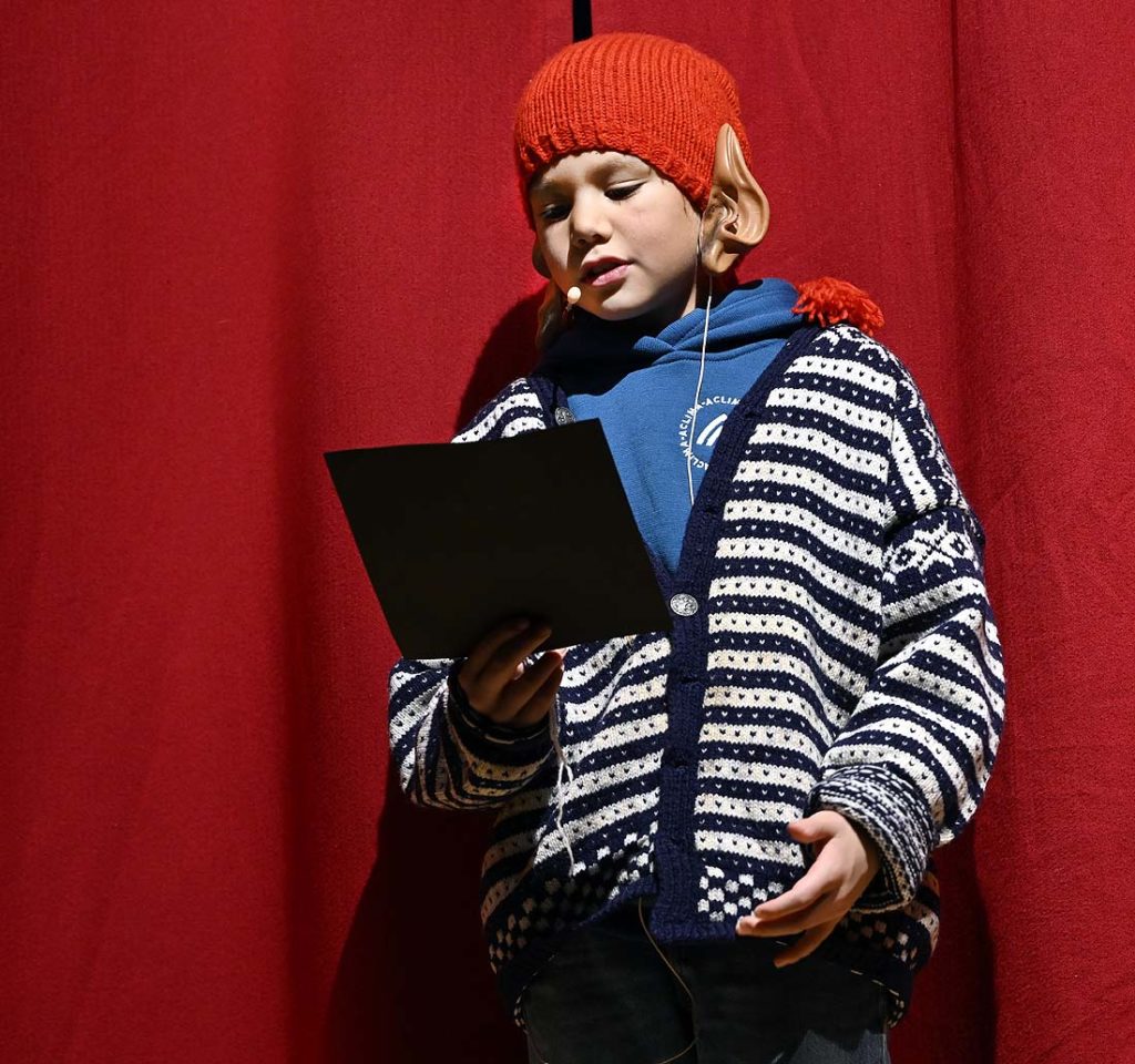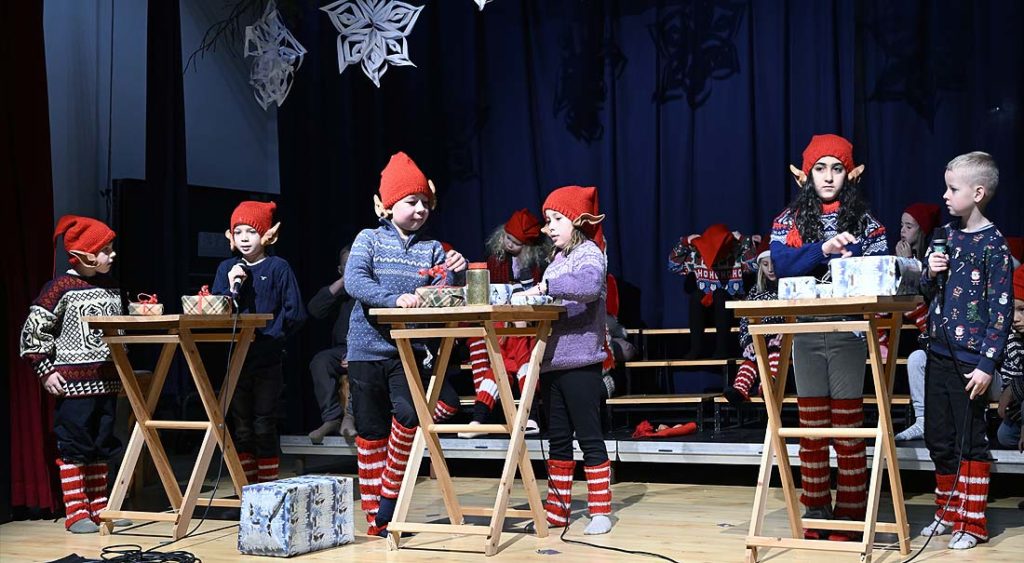 Her var det både skuespill, allsang og opplesninger av forskjellig slag – og selvfølgelig luciatog. I år er det bare to gutter i 3. klasse, så luciatoget var rimelig kort; bare to stjernegutter var med. Men de fikk god sangstøtte av en gjeng fjerdeklassinger.