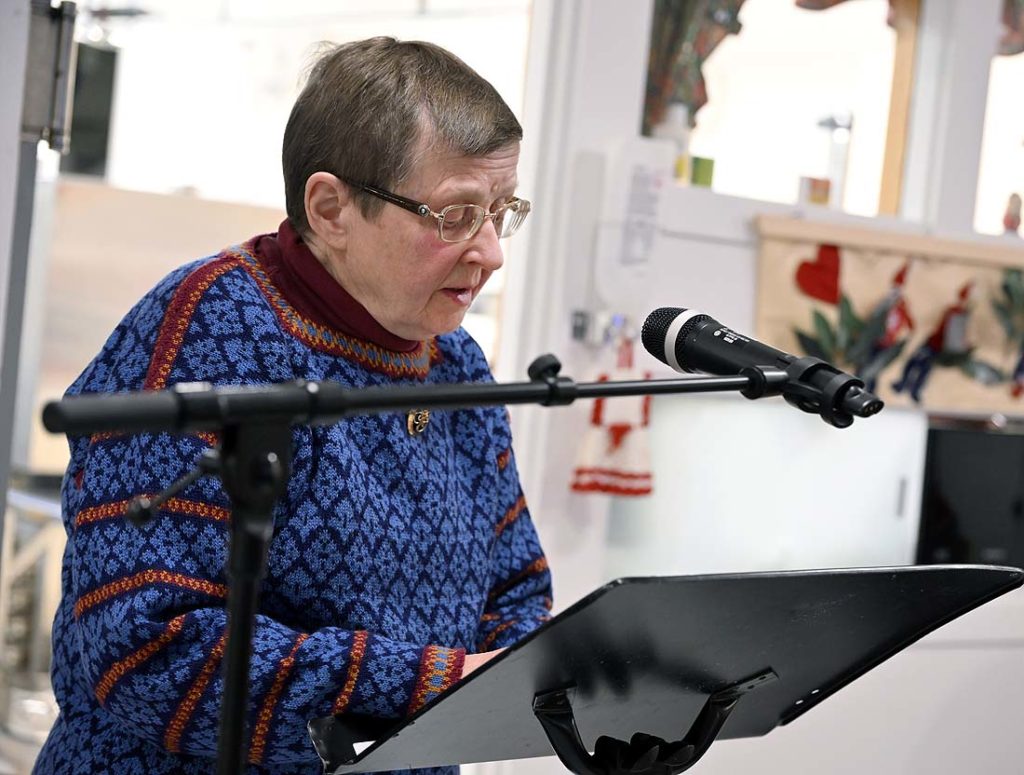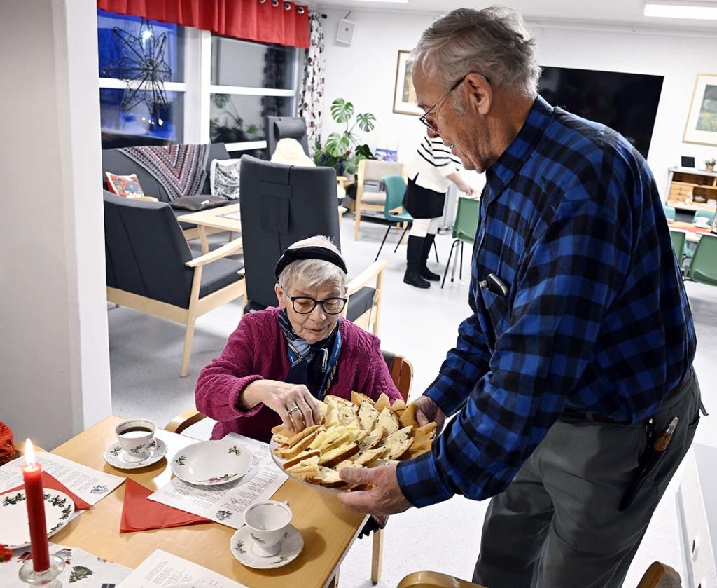 Det var god stemning i stua da beboere og gjester samlet seg rundt festkledde bord. Bjørg Irene Nilsen ledet festen og uttrykte stor takknemlighet for å få komme til Hedalsheimen også i år. Hun fortalte at hun selv har deltatt på julefesten i ti år, og at Frelsesarmeen hadde hatt ansvar for programmet i rundt 30 år før hun begynte sin tjeneste der.