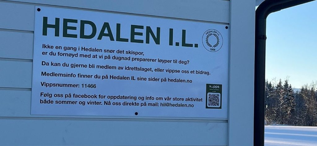 Lysløypa, skøytebanen og skiløypa på Jennlismyra prepareres jevnlig og kan fritt benyttes av alle interesserte. Meld deg gjerne inn som medlem i Hedalen idrettslag eller Vipps oss et bidrag på vippsnummer 11466.
