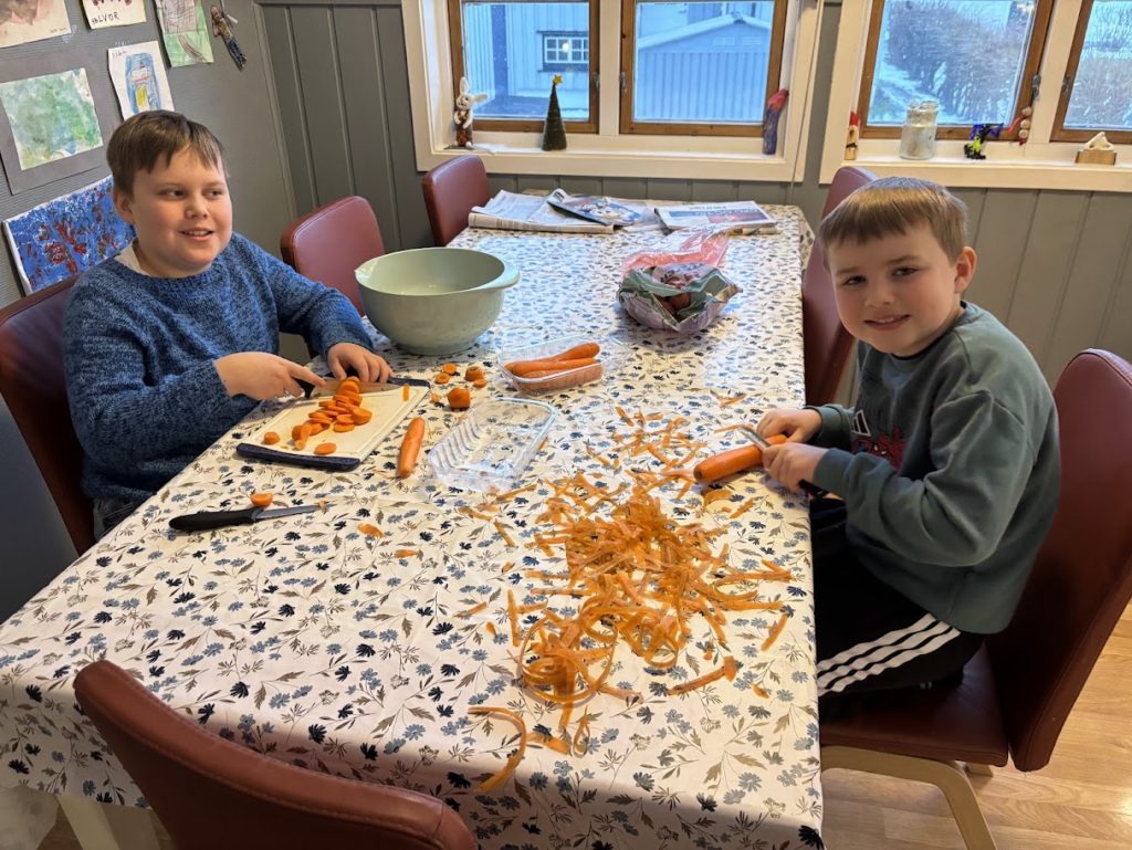 På søndagene setter vi av et par timer for å lage mat. Som regel lages det en middagsrett som både er middag på mandag og også pakkes i 2–3 porsjoner for fryseboksen. I tillegg lages gjerne matmuffins, pizzasnurrer og/eller brød. Ungene involveres – for Tårnfrid og Tårnfred har lite interesse i å kutte grønnsaker i timesvis sjøl 😉 Vi tror også at barn har godt av å ta del i oppgavene i huset.